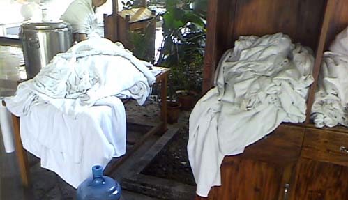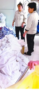 城市信報(bào)記者臥底青島城投艾麗華溫泉所拍照片,地巾、毛巾、浴袍等洗完后堆在地上分類。