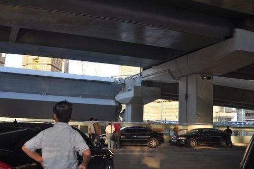 現(xiàn)場(chǎng)已經(jīng)被封鎖,有大量警察和武警站崗,在垮塌的橋梁四周都已設(shè)置了警戒線,而觀察塌橋視界最好的一棟正在施工的高樓工地門口,有兩名工地管理人員模樣的人正在守門,記者一進(jìn)去就被勸出來。