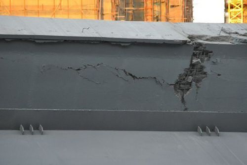 記者現(xiàn)場(chǎng)看到,從橋體結(jié)構(gòu)來看,出事的大貨車所??康纳蠘蛟训酪还灿兴膫€(gè)橋墩支撐,其中最接近地面的橋墩是一個(gè)蓋式橋墩,東面支撐該垮塌橋面的撐臂北面部分已經(jīng)斷掉一半,南面完好,最高處的橋墩則有兩根立柱支撐,上部靠西一側(cè)承受著引橋半幅橋面的重壓,靠東一側(cè)則支撐匝道上橋處,其南面支撐垮塌橋面的一半結(jié)構(gòu)中,也斷了大約兩米。