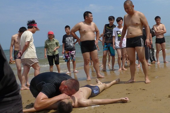 煙臺浴場游客落水 老外攜寵物犬下海救人(組圖)