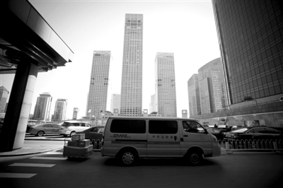 這是CBD角落隨處可見的情形??爝f員們像釘入CBD寫字樓空隙的楔子。對于擁有89座寫字樓的CBD來說,快遞是他們活動的神經(jīng)元。