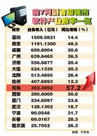 在這15個計劃單列市和副省級城市中,前7個月,按照軟件業(yè)務收入總量進行排名,分別是深圳、南京、成都、廣州、濟南、大連、沈陽、杭州、青島、西安、廈門、武漢、寧波、長春、哈爾濱,其中,排名第一的深圳實現軟件業(yè)務1509.58億元,同比增長14.4%;排名第二的南京實現軟件業(yè)務收入 1191億元,同比增長48.5%;排名第三的成都實現軟件業(yè)務收入699.8億元,同比增長30.6%。我市盡管在所有計劃單列市和副省級城市中軟件業(yè)務收入僅排名第九,但增長速度卻排名第一,高于排名第二的南京近10個百分點。