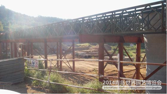 ??? 2014青島世園會園區(qū)配套工程4號橋位于規(guī)劃F線跨越畢家水庫(天水)上游匯水口處,橋區(qū)處道路中線由直線和圓曲線組成,曲線半徑為280米。橋面寬度 11.5米,上部結構為鋼箱梁結構,共計三跨,全長110米;橋墩采用鋼筋混凝土花瓶墩,共計兩顆;基礎采用鋼筋混凝土擴大基礎,共計兩座;橋臺采用鋼筋混凝土薄壁橋臺,共計兩座。