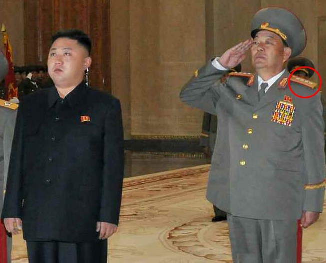 人民軍總參謀長玄永哲站在金正恩左邊,佩戴大將軍銜肩章(四顆小星)。而他此前曾被授予次帥軍銜(肩章一顆大星)。