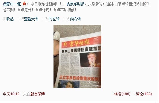 19日上午,網(wǎng)友“蒙山一倔”在微博爆料稱“趙本山涉黑轉(zhuǎn)巨資被扣留”,還附上報紙新聞的照片,引起網(wǎng)友廣泛轉(zhuǎn)發(fā)。但很快有網(wǎng)友指出圖片中的報紙是“京華快報”,經(jīng)查證是并不存在的假報紙,并非“京華時報”。