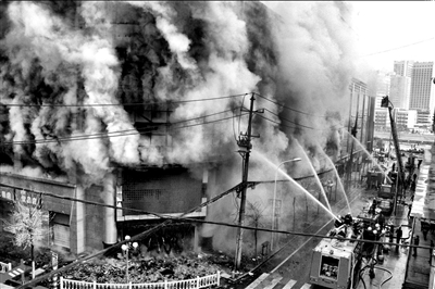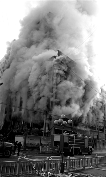 住在與失火大廈一街之隔的圣亞大酒店的何先生介紹,昨晨8時(shí)他起床后發(fā)現(xiàn),國貿(mào)大廈燃起大火,滾滾濃煙沖向空中。大廈1至8層均被大火殃及,不斷有明火從窗戶冒出。濃煙從大廈各窗口和通道沖出,煙柱高約百米。當(dāng)時(shí),大廈外滿是消防車、警車、急救車,消防隊(duì)員用水槍向國貿(mào)大廈猛噴,但效果甚微。由于天氣寒冷,大廈周圍的流水已經(jīng)結(jié)成冰。