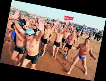 9時(shí)30分,整個(gè)一浴沙灘沸騰起來(lái),300多名冬泳愛(ài)好者們喊著號(hào)子沖向大海。冰冷刺骨的海水一時(shí)間浪花四濺,海水中人頭攢動(dòng)?!斑@個(gè)天穿著棉衣都覺(jué)冷,他們還往海里鉆,實(shí)在太厲害了!”許多來(lái)看熱鬧的市民圍在沙灘上,看這幫“不怕冷的人”撲通撲通跳進(jìn)水中,不禁發(fā)出驚嘆。穿著棉衣的孫先生見(jiàn)一名冬泳愛(ài)好者從海中上岸還有說(shuō)有笑,忍不住上前摸摸對(duì)方的胳膊,試試涼不涼?!肮阍囋嚐岷鹾醯?,一點(diǎn)不冷?!边@名冬泳愛(ài)好者也趁機(jī)把手伸到孫先生的臉上,讓孫先生打了個(gè)寒戰(zhàn)。大家都樂(lè)了起來(lái)。