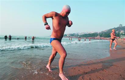 兩三分鐘后,首批下水的冬泳者開(kāi)始上岸,10多分鐘后,大家陸續(xù)返回岸上,繼續(xù)鍛煉身體?!耙话愣菊呦滤褪?分鐘,能堅(jiān)持到10分鐘的就是高手了?!笔卸緟f(xié)會(huì)楊主席介紹。20多分鐘后,記者發(fā)現(xiàn)海里還有1個(gè)人沒(méi)有上來(lái),詢問(wèn)得知,那個(gè)人是聾人冬泳隊(duì)的樊景魁,今年已經(jīng)55歲。“老樊能游半個(gè)小時(shí),厲害啊?!鄙碁┥显S多冬泳愛(ài)好者對(duì)老樊佩服有加。 (記者 趙健鵬)