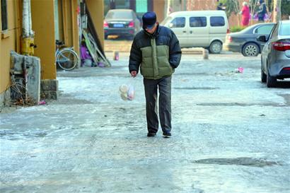 ????在商城路上,記者發(fā)現(xiàn)由于這里道路狹窄,且馬路兩旁都停滿了車,但在路面大面積結冰的情況下,路人的腳步十分緩慢,一段不到200百米的路面,一些腿腳不方便的老年人甚至要走上10分鐘。由于冰層較厚,一些老年人手持的拐棍在這里失去了功效,只能扶著路邊的一處矮墻緩慢行走。