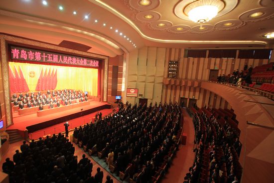 ????在雄壯的國歌聲中,市十五屆人大二次會議勝利閉幕(青島新聞網(wǎng)記者 陳志偉 攝)