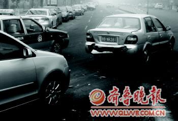 14日10時(shí)30分許,南京路上,兩輛私家車在霧中發(fā)生追尾事故。張曉鵬 高開元 攝