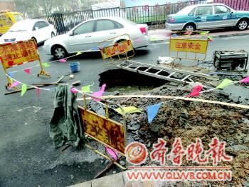 ????“這個坑很危險,早上有輛車開到這里,還差點掉下去?!备浇囊晃痪用裾f,幸好那名司機反應快。其實13日下午這里就已有小小的塌陷,但不是很嚴重,沒想到過了一夜,路面竟發(fā)生了大面積的塌陷。