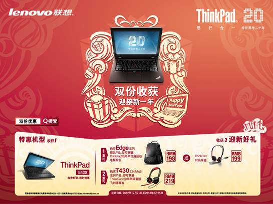 ????手中的筆記本已經(jīng)風(fēng)燭殘年,運(yùn)行速度慢得讓你無(wú)法忍受?鍵盤(pán)沒(méi)手感,電池不給力,散熱還悲劇,辛苦打拼了一整年的你是否迫切地想換掉手中的“老爺機(jī)”?忍過(guò)了“雙十一”,撐過(guò)了“世界末日”,緊捂荷包遲遲不出手的你難道是在等待它的消息?徘徊各大賣(mài)場(chǎng)猶豫不決只因?yàn)槿鄙僖粋€(gè)非買(mǎi)不可的理由? ????現(xiàn)在是時(shí)候出手了!自2012年12月21日起至2013年2月25日,聯(lián)想ThinkPad將針對(duì)旗下多款重磅機(jī)型展開(kāi)主題為“年末特惠雙份收獲”的年底促銷(xiāo)活動(dòng)。無(wú)論是年輕時(shí)尚的Edge系列、傳承經(jīng)典的T系列筆記本、還是代表專(zhuān)業(yè)魅力的S系列筆記本,只要購(gòu)買(mǎi)促銷(xiāo)指定機(jī)型,即可得到超值限量好禮,為你的新年帶來(lái)雙份收獲,雙份驚喜!