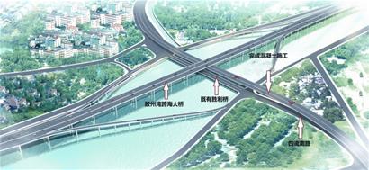 ????四流路跨線橋的位置在原勝利橋的側上方,與膠州灣大橋相交叉??缇€橋通車之后,市民開車就可以不走勝利橋,而直接從跨線橋快速通行。 (記者 田璐)