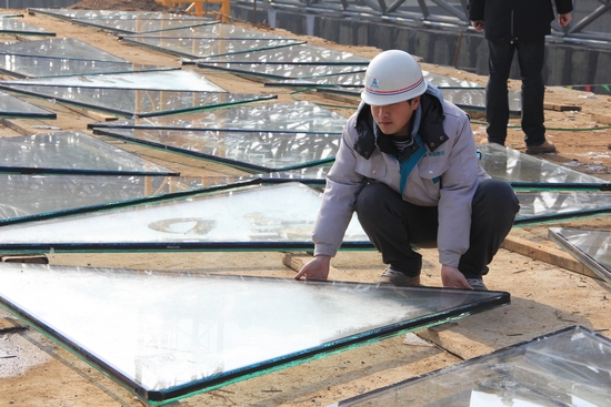 在鋼結(jié)構(gòu)完成封頂?shù)耐瑫r(shí),記者看到,植物館玻璃幕墻的拼嵌工作已經(jīng)在同步進(jìn)行當(dāng)中。在植物館西北側(cè)的穹窿位置,已經(jīng)拼嵌好部分玻璃幕墻,每塊玻璃都呈三角形,在陽光的照射下閃爍著琉璃般的光彩??梢韵胂螅?dāng)整個(gè)植物館15000多塊玻璃幕墻拼嵌完畢,呈現(xiàn)在世人眼前的植物館,將如一座水晶殿堂一般閃亮剔透。