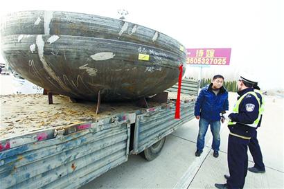 ????上午11時許,一輛拉著兩個“超級大碗”的貨車引起高速交警注意,由于大碗直徑達到3米,超過了車體的寬度,兩邊的擋板都垂落在下方。大碗底部是圓的,因此用三角鐵焊在了車體上??吹浇痪瘷z查,駕駛員連忙拿出了 《山東省運載超限物品車輛通行證明》,表明自己運輸行為的合法?!拔覐奶┌策\載兩個油罐的封頭到威海石島,全程走高速,限速每小時70公里。”駕駛員趙某說。