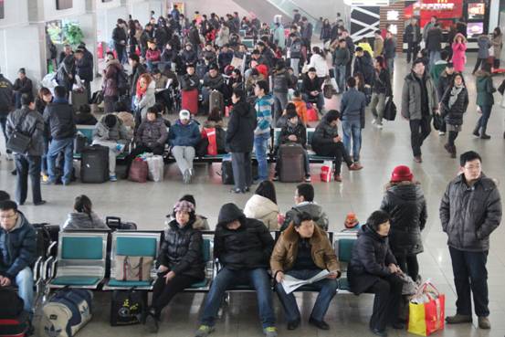 ????返鄉(xiāng)旅客在長途汽車站候車大廳等候????