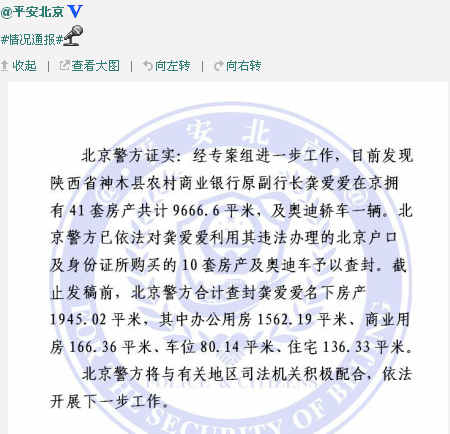 ????北京警方證實:經(jīng)專案組進一步工作,目前發(fā)現(xiàn)陜西省神木縣農(nóng)村商業(yè)銀行原副行長龔愛愛在京擁有41套房產(chǎn)共計9666.6平米,及奧迪轎車一輛。北京警方已依法對龔愛愛利用其違法辦理的北京戶口及身份證所購買的10套房產(chǎn)及奧迪車予以查封。截止發(fā)稿前,北京警方合計查封龔愛愛名下房產(chǎn)1945.02平米,其中辦公用房1562.19平米、商業(yè)用房166.36平米、車位80.14平米、住宅136.33平米。北京警方將與有關(guān)地區(qū)司法機關(guān)積極配合,依法開展下一步工作。