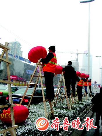 為了迎接春節(jié),工人們?cè)谘┲邪惭b大紅燈籠。本報(bào)記者程凌潤(rùn)攝
