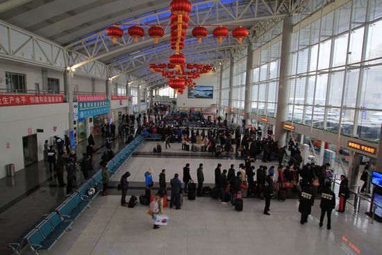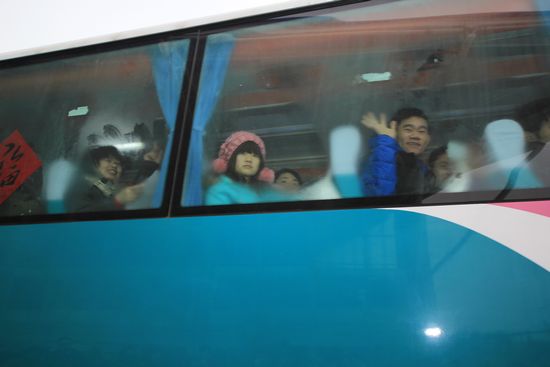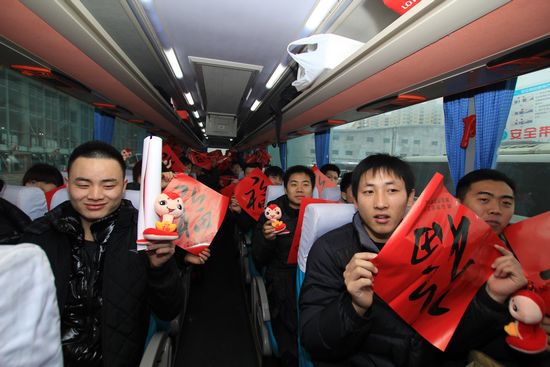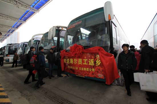 ?????青島新聞網(wǎng)2月6日訊 今天早上7:40,交運(yùn)集團(tuán)青島汽車東站候車大廳內(nèi)張燈結(jié)彩,人們臉上洋溢著即將回家團(tuán)聚的喜悅。承載著1051海爾員工的13個長途車班次陸續(xù)開出了青島汽車東站,平安運(yùn)送農(nóng)民工兄弟踏上了返鄉(xiāng)旅途,這是青島市總工會、交運(yùn)集團(tuán)春節(jié)前歡送農(nóng)民工平安返鄉(xiāng)的平常一日。市總工會、交運(yùn)集團(tuán)有關(guān)領(lǐng)導(dǎo)上車為返鄉(xiāng)員工發(fā)放了福字、吉祥物等, 祝福辛勞一年的職工們平安回家過年。細(xì)心的汽車東站員工還為返鄉(xiāng)務(wù)工人員準(zhǔn)備了免費(fèi)姜湯御寒。