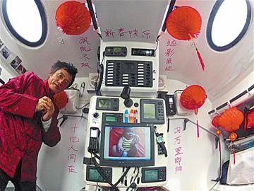 ????根據(jù)中國的傳統(tǒng)習(xí)俗,除夕上午就要把春聯(lián)貼起來,雖然遠(yuǎn)離家鄉(xiāng),歸心似箭的郭川卻未能免俗。昨天,他在“青島號”上因陋就簡,用紅色字跡的中性筆在船艙內(nèi)壁上“揮毫潑墨”,寫了一副“春聯(lián)”。上聯(lián)書:遠(yuǎn)影雖遠(yuǎn),四萬里即歸;下聯(lián)書:孤帆不孤,十億人同在;橫批:新春快樂。上聯(lián)和下聯(lián)之間的顯示屏上,郭川剛滿一周歲的小兒子郭倫布的照片分外醒目。