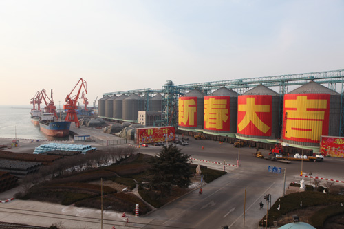 ??? 在青島港,飽含著吉祥和祝福的“新春大吉”四個大字在青島港老港區(qū)糧罐上高高掛起。這代表著青島港向一年來支持港口發(fā)展的船東、貨主、各界賓朋及廣大員工送上新年最真摯的祝福。據(jù)了解,每個大字為575平方米,四字總計2300平方米,為全國最大祝福語。