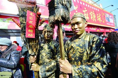 ????“我們就是想把活人雕塑的現(xiàn)代藝術(shù)做出傳統(tǒng)味道?!焙蛡鹘y(tǒng)藝人“趕時髦”不同,高家糖球攤位前的兩名現(xiàn)代藝術(shù)表演者卻挖空心思要“回到過去”。兩名活人雕塑表演者渾身黃銅色,頭戴瓜皮帽、身穿長袍,肩上扛著插滿糖球的草靶子,不斷變換著各種叫賣動作,吸引了眾多趕會市民來合影。表演活人雕塑的馬明告訴記者,他和另外一個“銅人”都是青島大學(xué)美術(shù)系的大三學(xué)生,這次趁著節(jié)會來勤工儉學(xué)?!拔覀儙讉€同學(xué)成立了藝術(shù)工作室,3年來參加了不少傳統(tǒng)節(jié)會?!瘪R明說,兩年前他在棧橋看到有活人雕塑,覺著憑借自己的美術(shù)功底繪制這樣的行頭不算難事,就和3名同學(xué)成立工作室對外“接活”。去年在一次民間山會中認(rèn)識了高家糖球的高士湘,這次已經(jīng)是第三次在高家糖球前亮相。高明說,他們的裝扮以傳統(tǒng)為主,長袍馬褂、磨刀老漢、釣魚蓑翁……都是他們的強項,讓現(xiàn)代藝術(shù)穿越到百年前。