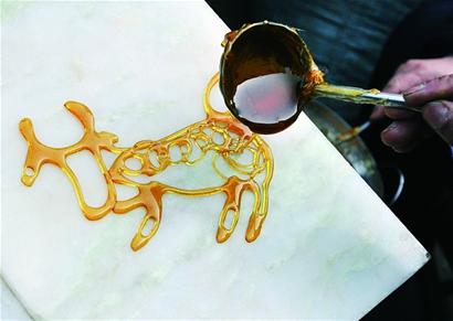 ????與捏面人師傅一樣,做糖畫的藝人也極富創(chuàng)新精神,糖畫攤上的作品不但有老鼠偷油、葫蘆蟈蟈……更多的作品還是具有現(xiàn)代抽象繪畫意味的糖畫?!皞鹘y(tǒng)手藝添加點時尚元素,年輕人會更喜歡。”劉德海師傅三個手指捏著一小勺糖稀,在白石板上左勾右畫,一只造型新穎的公牛就出來了。記者發(fā)現(xiàn),這只糖牛的造型夸張,與傳統(tǒng)紋樣完全不同,很有現(xiàn)代繪畫的味道?!澳阏f對了,我這是參考了當(dāng)代工藝美術(shù)大師韓美林的作品加工的?!眲煾档靡獾卣f,他的許多糖畫作品都是融入了當(dāng)代美術(shù)的夸張抽象手法。