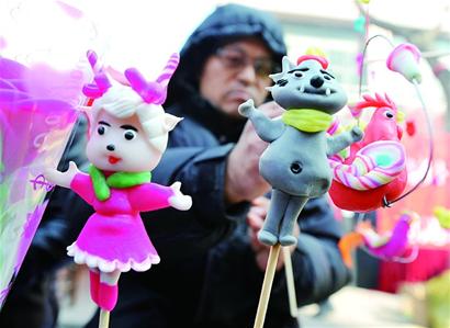 ????蘿卜元宵糖球會不但是蘿卜糖球小吃的天堂,也是各種傳統(tǒng)民俗老玩意的天下,趕潮流的民間藝人大膽創(chuàng)新,在傳統(tǒng)手工藝中融入現(xiàn)代元素,韓美林的變形動物、卡通片中的灰太狼、美羊羊紛紛成了糖畫、面人、糖人的造型?!昂⒆觽兿矚g什么卡通片,我就在家看什么,咱也得趕上潮流?!?2歲的孫師傅和徒弟從濟(jì)寧結(jié)伴來趕會,他們的拿手絕活是捏面人。幾塊顏色不同的面團(tuán)在他們手里,三下五除二就變成栩栩如生的各色面人。師徒兩人不但會捏豬八戒背媳婦、八仙過海等老樣式,灰太狼、喜羊羊、米老鼠、唐老鴨更是他們的強項。孫師傅說,他們的顧客主要是小朋友和年輕人,因此他們就得研究孩子們的心理。平時不趕會出攤時,他們就在家看電視,對著電視里的卡通人物創(chuàng)作新花樣。