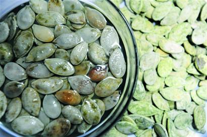 ????閑暇時光、歡聚時刻,和朋友們一同嗑瓜子聊天十分愜意,吃慣了原味瓜子,顏色鮮艷、味道獨特的綠茶瓜子、香芋瓜子受到越來越多人的喜愛,但如果因為嗑這類瓜子而染得口舌發(fā)綠不免讓人感到難堪。對此專家表示,這類帶色瓜子不僅讓人難堪,而且極有可能是由工業(yè)色素與香精染制而成,長期食用對人體危害很大。