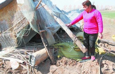 3月9日晚,一場大風過后,史女士的十幾個大棚全倒下了。記者 徐新東 劉鑫 攝