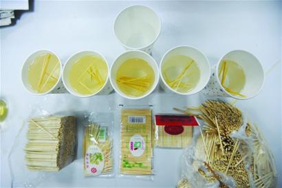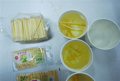 ????將牙簽放進(jìn)熱水中,1號(hào)牙簽立即冒出氣泡,刺鼻氣味明顯。 2號(hào)、5號(hào)牙簽的氣泡明顯大于3號(hào)、4號(hào)。半個(gè)小時(shí)后記者將牙簽取出,1號(hào)牙簽上有薄薄一層白色顆粒狀物質(zhì),2號(hào)牙簽用指甲一掐就可以掐斷,五種牙簽表面都不再光滑。雖然實(shí)驗(yàn)結(jié)果并不如一次性筷子浸泡后那么具有視覺沖擊力,但記者得到的同樣也是五杯泛黃的“茶水”,尤其浸泡1號(hào)牙簽的水最黃。而包裝最規(guī)范的3號(hào)牙簽,卻不是水最清的,被4號(hào)牙簽取代。記者將一杯清水放在旁邊做對(duì)比,浸泡后得到的黃水更加明顯。