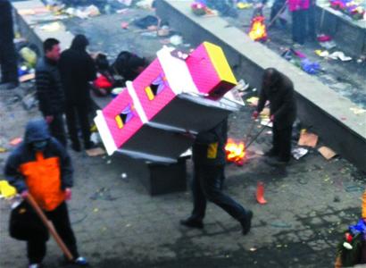 記者隨后在殯儀館祭奠區(qū)看到,至少有三四幫祭奠者在祭奠區(qū)的角落焚燒紙人紙馬和紙房子,燃燒冒起的濃煙和紙灰被風吹得到處都是。記者進入祭奠區(qū)的停車場時,一輛微型面包車駛過來,駕駛員打開車廂后蓋,露出里面塞得滿滿的扎制祭奠用品。在司機的指點下,參加祭奠的五六名男女分別從車廂中拿下“轎車”、“房子”、“牛馬”等喪葬用品,徑直走向祭奠區(qū)?!拔覀冮T衛(wèi)不可能讓市民帶著迷信喪葬用品進入園區(qū),很可能是商販從墻頭遞進去的。”殯儀館工作人員表示,殯儀館內(nèi)嚴禁焚燒迷信喪葬用品,但祭奠的人太多,工作人員可能“一時看不過來”,讓違規(guī)人員鉆了空子。