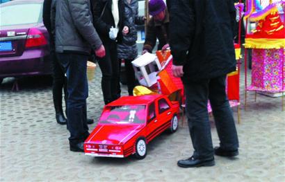 ????記者沿重慶南路通往殯儀館正門的道路往坡上走,發(fā)現(xiàn)道路兩側(cè)有10多家經(jīng)營鮮花和喪葬用品的店鋪,遠遠看去,多家店鋪中隱約擺放著紙人紙馬?!拔疫@里有3種檔次,從280元一套到980元一套的都有。”記者走進一家喪葬用品店,女店主從門口的路邊攤跑過來招呼。店主告訴記者,檔次最高的套系中包括目前最流行的“十大件”:童男童女、牛馬、冰箱、彩電、空調(diào)、金庫銀庫、i-phone手機、豪華小轎車、筆記本電腦和仿真美元?!澳阍谖业昀镔I,我就負責給你帶進殯儀館祭奠區(qū),到了那里就可以隨便燒了?!迸曛髡f。