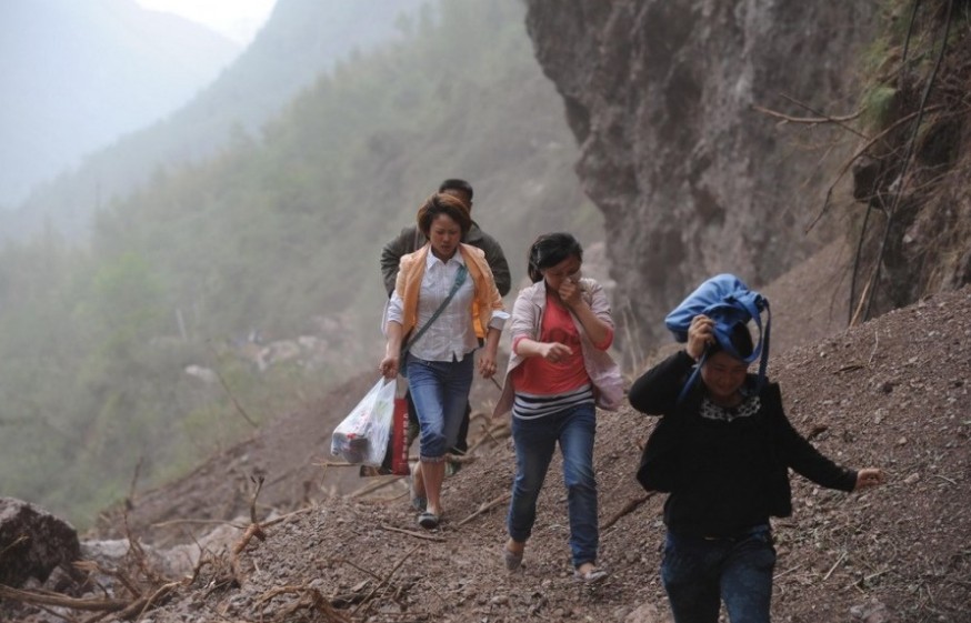 4月20日,群眾快速通過寶盛鄉(xiāng)山體塌方地段。