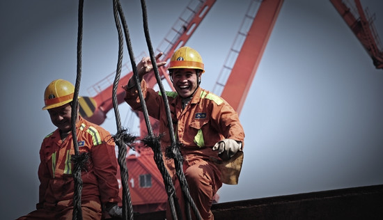 ????董家口港區(qū),5月1日,滿載20.38萬噸奧砂、奧粉的“興旺”輪靠泊??慷铱诘V石碼頭,剛剛通過國家驗(yàn)收一個(gè)多月的世界最大的礦石碼頭作業(yè)現(xiàn)場一片繁忙的場面。(記者 謝小真)