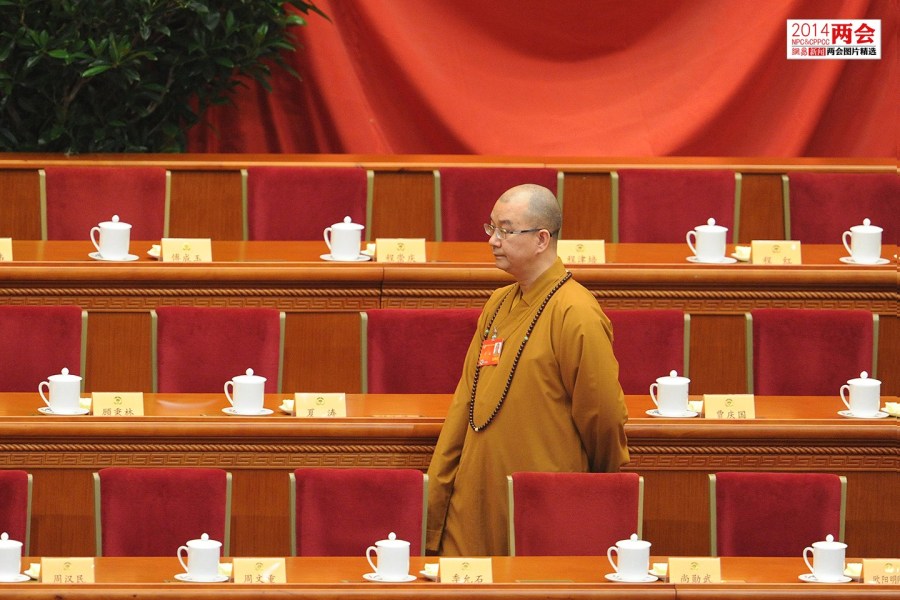2014年3月3日,北京人民大會堂,在全國政協(xié)會議開始前一位佛教代表到達現(xiàn)場準(zhǔn)備就坐。