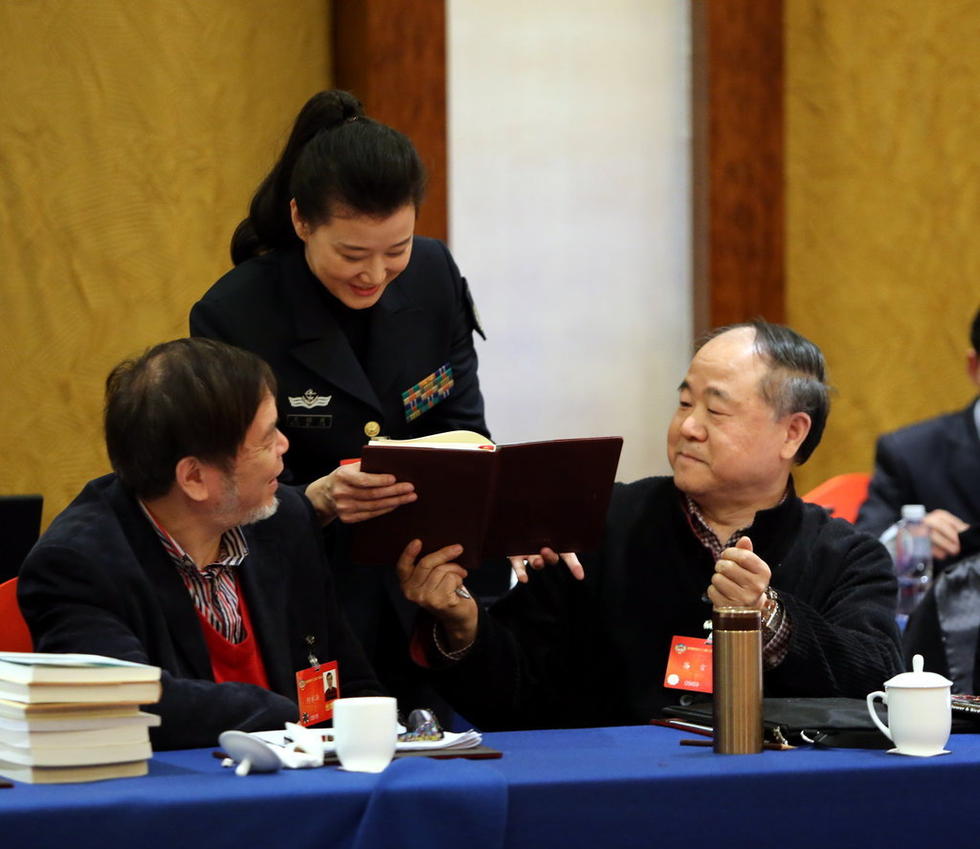 03月06日,全國(guó)政協(xié)十二屆二次會(huì)議文藝界別委員小組討論會(huì)。宋祖英利用會(huì)議間隙,將一本畫冊(cè)遞給莫言,請(qǐng)求簽名。