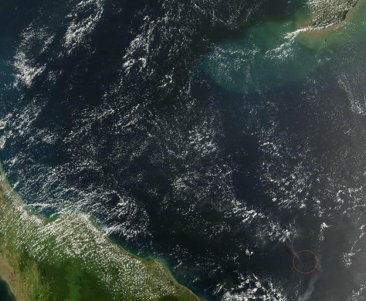 ????據(jù)美國宇航局發(fā)布的圖片顯示,北京時間3月9日11:35,NASA的衛(wèi)星Terra/MODIS拍攝了相關海域的一張250米精度的衛(wèi)星圖像,圖片定位約在104.6 E,6.1 N,右下角紅圈疑似馬航370失事地點。