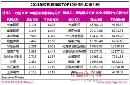 ????相關(guān)數(shù)據(jù)表明:2013年收視TOP30電視劇的制作機(jī)構(gòu)除了“央視”、“湖南廣電”外,其他均是民營制作機(jī)構(gòu)。其中,完美影視表現(xiàn)尤為搶眼。在2013年收視率前30的電視劇中,完美影視憑借《咱們結(jié)婚吧》、《陸貞傳奇》、《打狗棍》、《小爸爸》、《老有所依》占據(jù)5席,位列第一陣營。而綜合電視臺收視率與網(wǎng)絡(luò)播放看,在TOP30的劇目中,完美影視的總收視率和播放總量均排名第一,超越傳統(tǒng)的業(yè)內(nèi)“大佬”,成為名副其實(shí)的中國影視劇“一哥”。