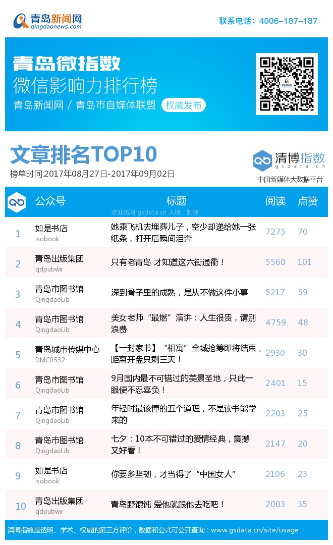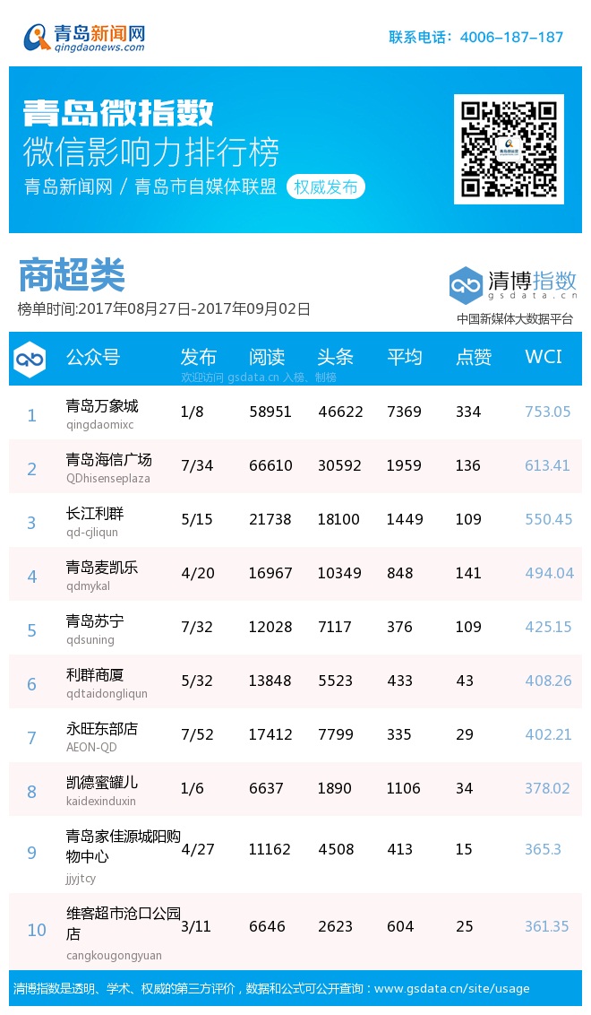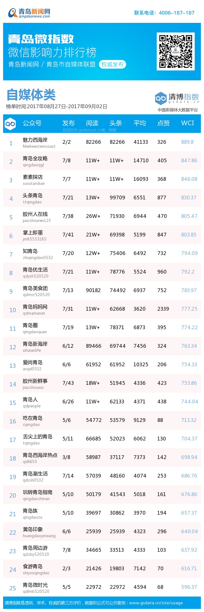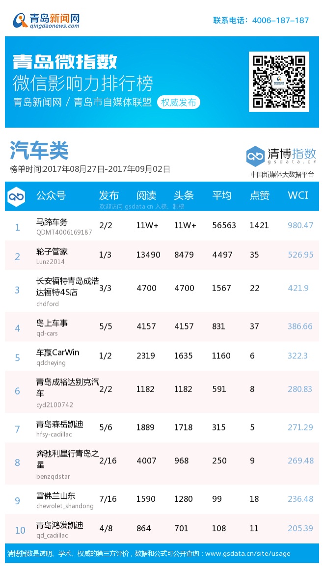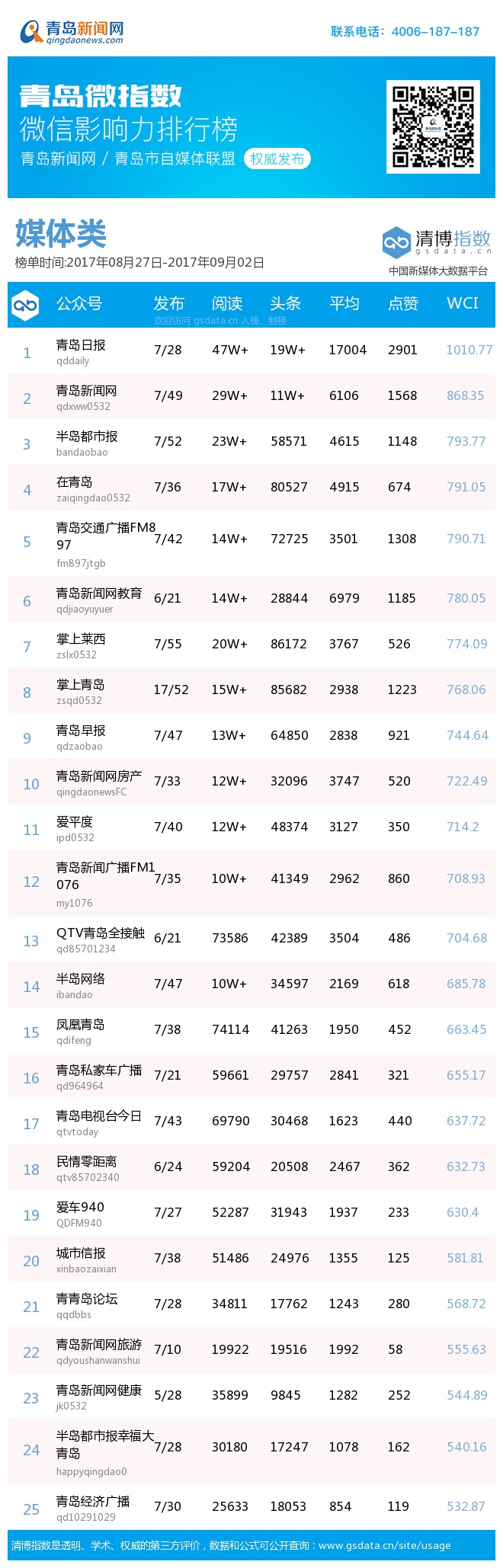 由青島新聞網(wǎng)聯(lián)合清博指數(shù)平臺聯(lián)手打造的“青島微指數(shù)微信影響力排行榜”,通過對各行業(yè)微信公眾號的日常監(jiān)測,對所有賬號在統(tǒng)計周期內(nèi)所發(fā)布內(nèi)容的發(fā)文總數(shù)、總閱讀數(shù)、頭條閱讀數(shù)、平均閱讀數(shù)及總點贊數(shù)等海量數(shù)據(jù)進行分析,幫助各行業(yè)新媒體小編更好地運營微信。