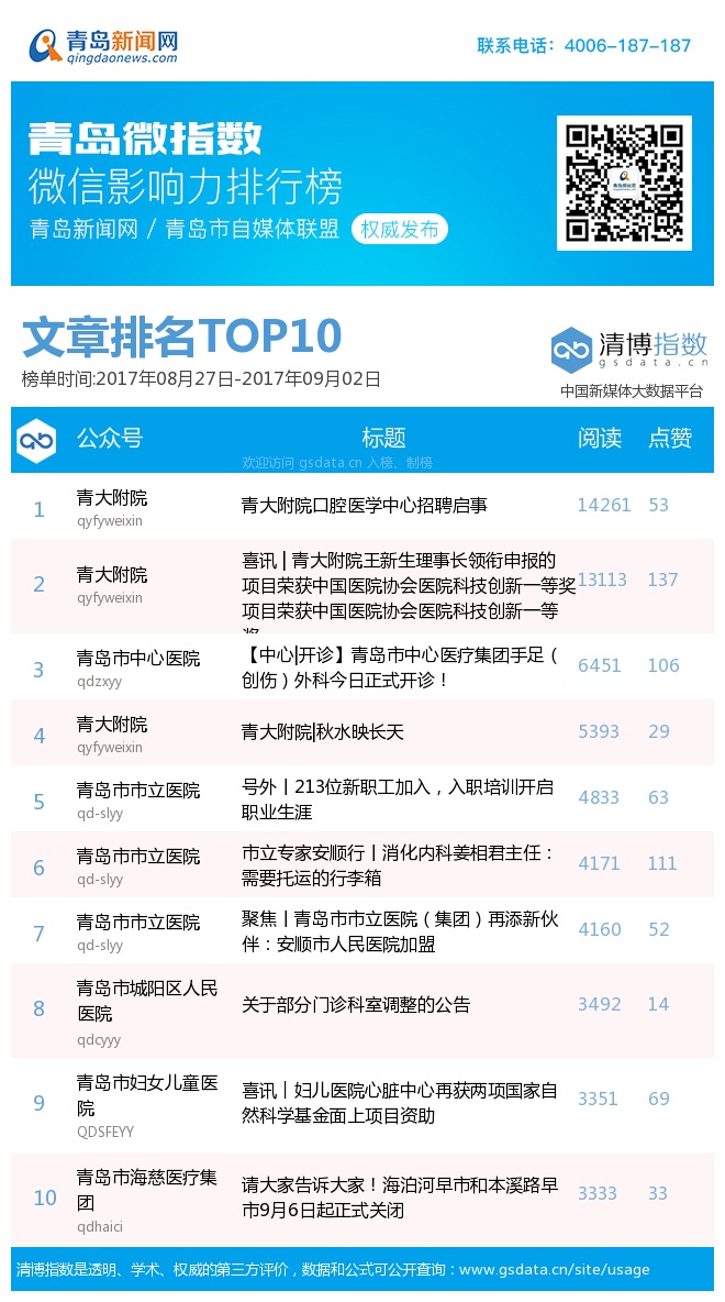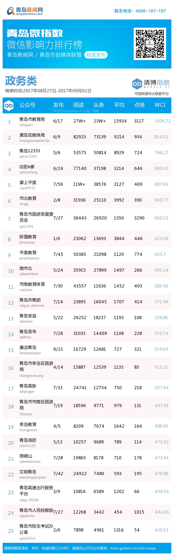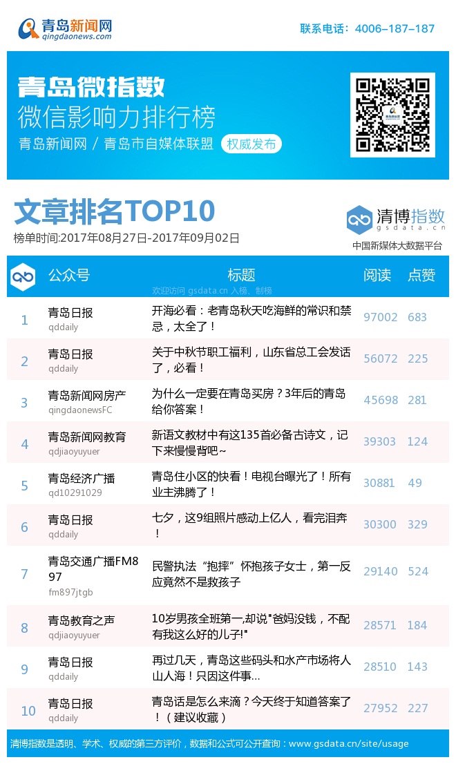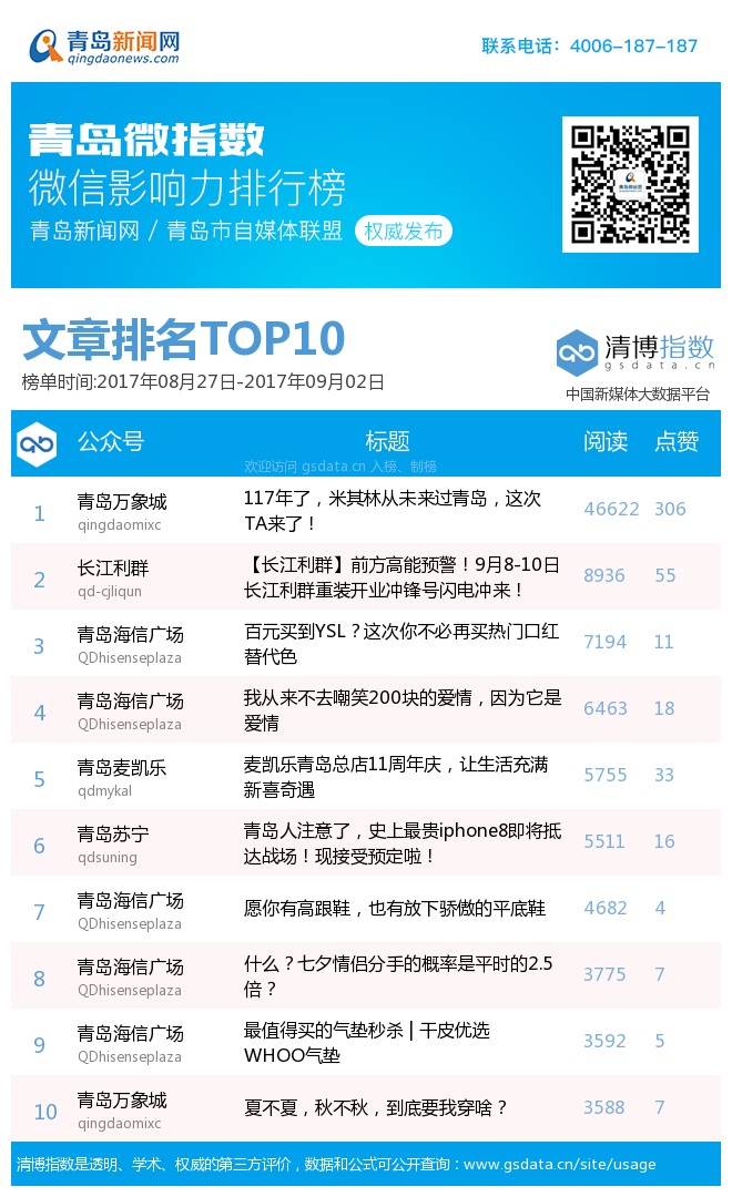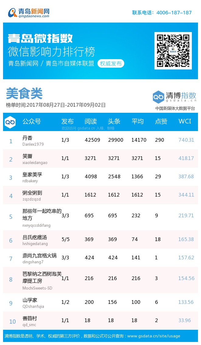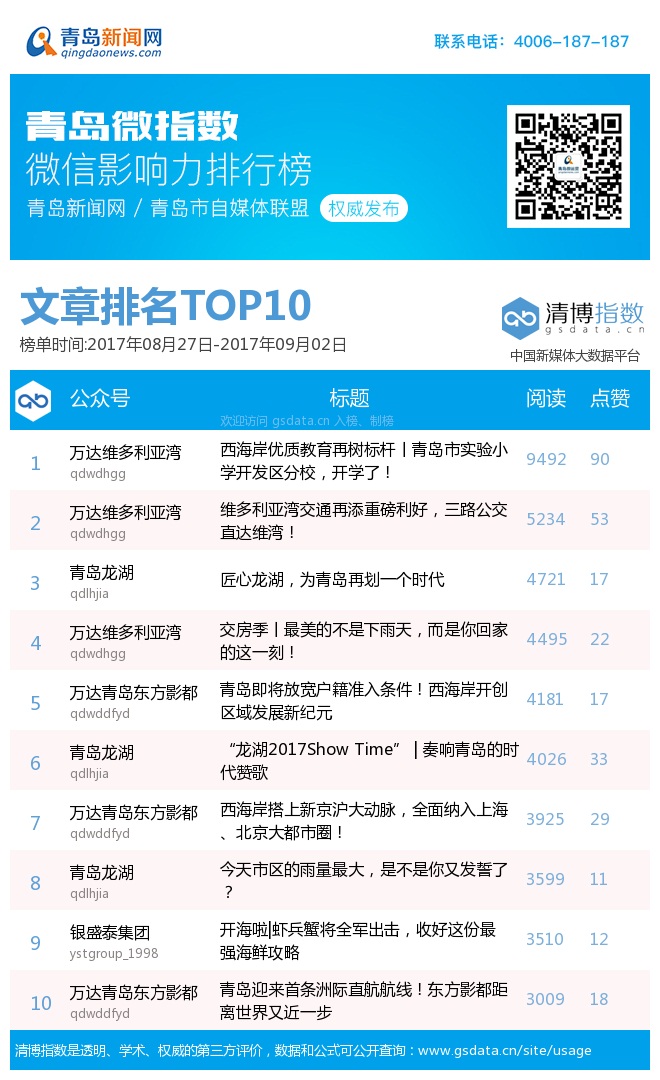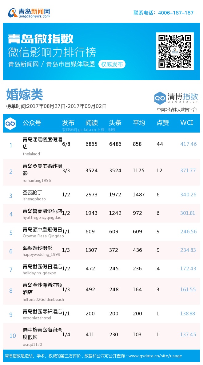由青島新聞網(wǎng)聯(lián)合清博指數(shù)平臺聯(lián)手打造的“青島微指數(shù)微信影響力排行榜”,通過對各行業(yè)微信公眾號的日常監(jiān)測,對所有賬號在統(tǒng)計周期內(nèi)所發(fā)布內(nèi)容的發(fā)文總數(shù)、總閱讀數(shù)、頭條閱讀數(shù)、平均閱讀數(shù)及總點贊數(shù)等海量數(shù)據(jù)進行分析,幫助各行業(yè)新媒體小編更好地運營微信。