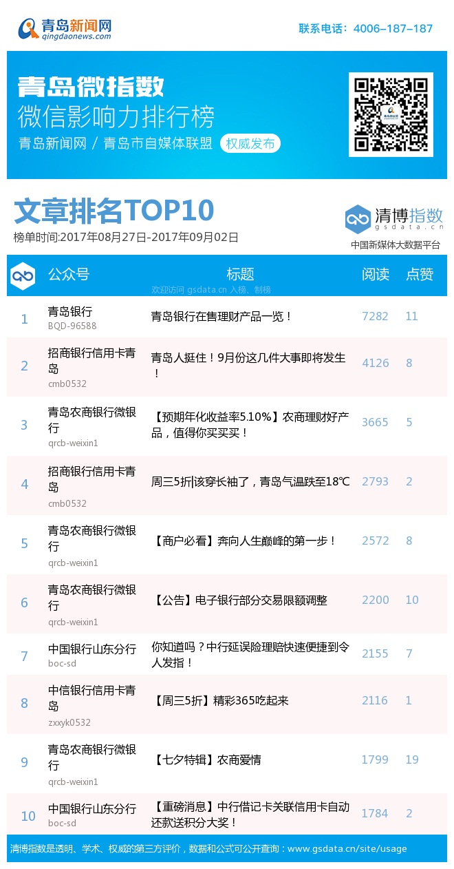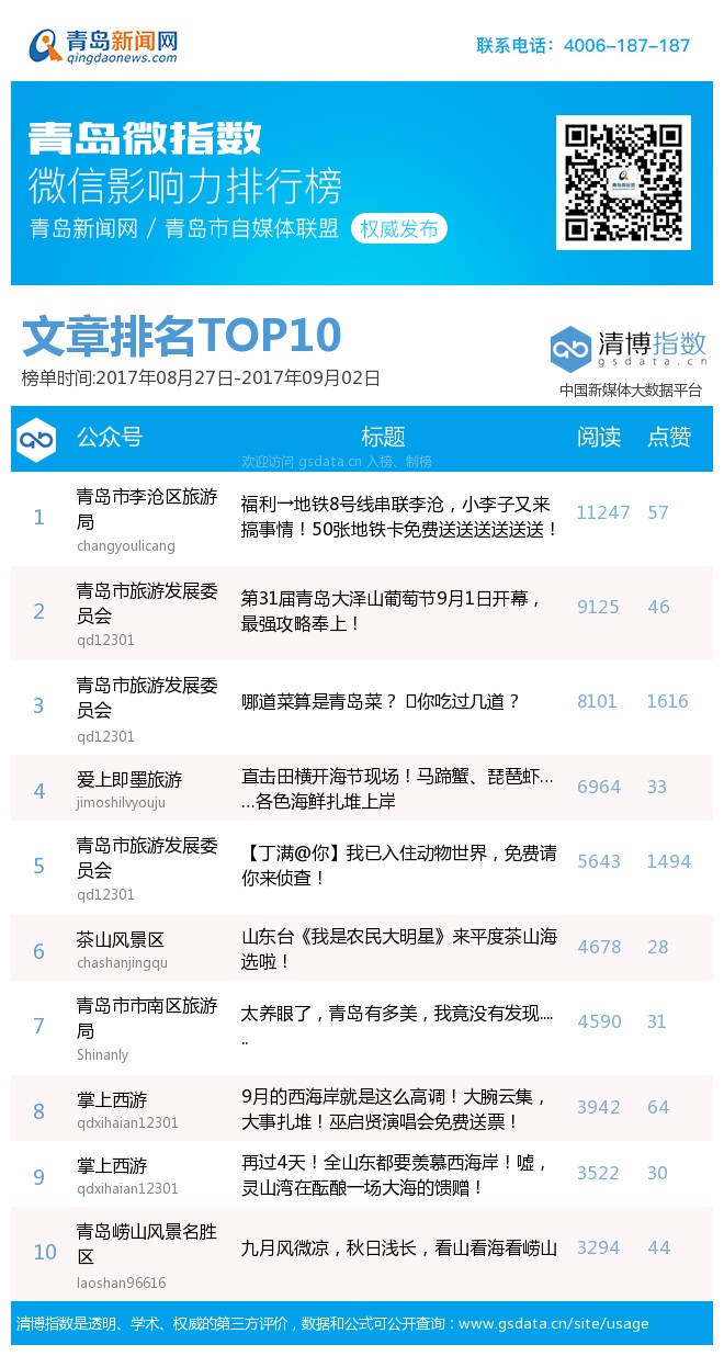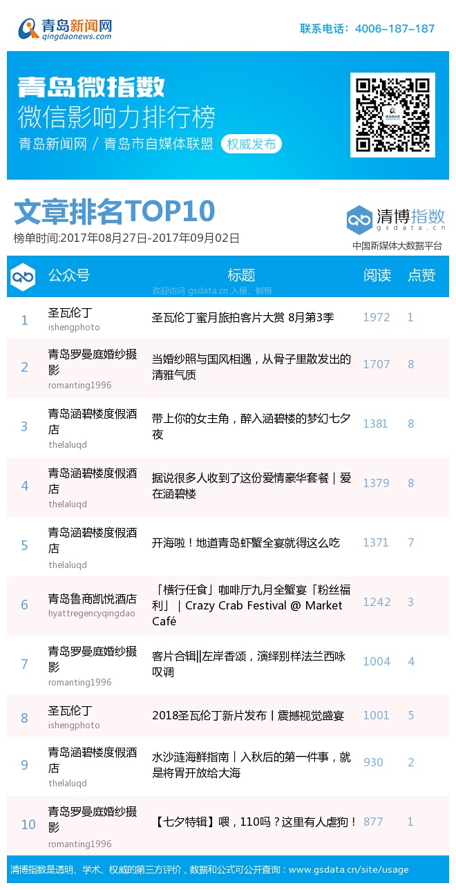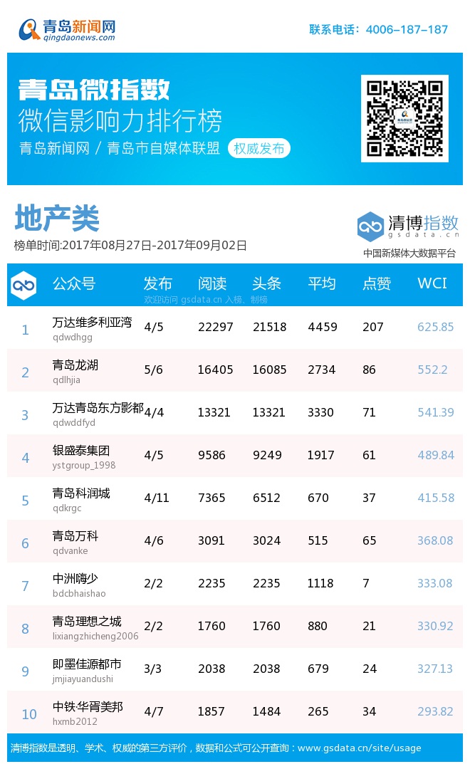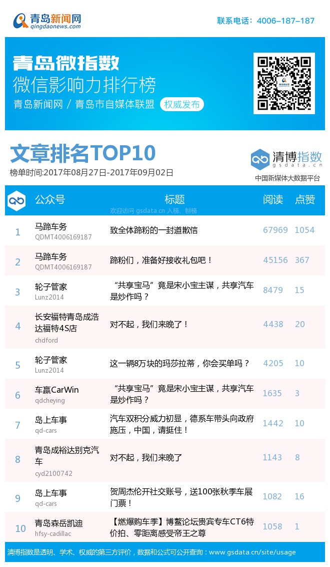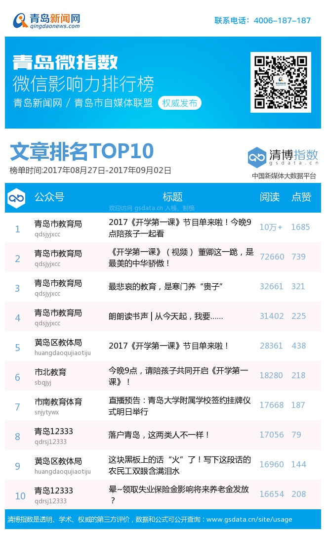 由青島新聞網(wǎng)聯(lián)合清博指數(shù)平臺聯(lián)手打造的“青島微指數(shù)微信影響力排行榜”,通過對各行業(yè)微信公眾號的日常監(jiān)測,對所有賬號在統(tǒng)計周期內(nèi)所發(fā)布內(nèi)容的發(fā)文總數(shù)、總閱讀數(shù)、頭條閱讀數(shù)、平均閱讀數(shù)及總點贊數(shù)等海量數(shù)據(jù)進行分析,幫助各行業(yè)新媒體小編更好地運營微信。