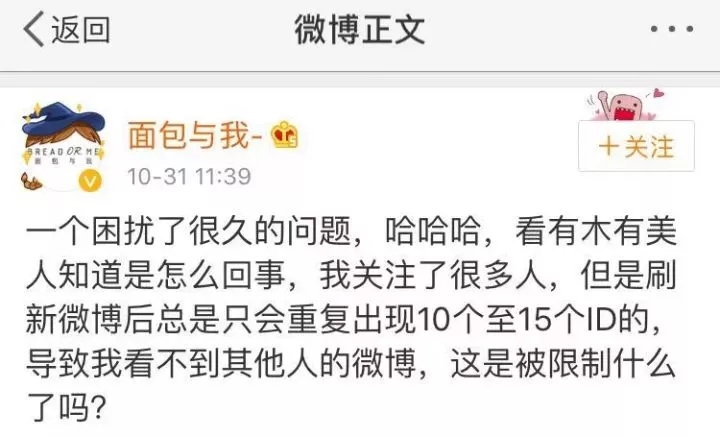 比如這位美食博主發(fā)現(xiàn),自己關(guān)注了很多人,但是刷新微博后總是只會重復(fù)出現(xiàn)10-15個(gè)ID的信息,導(dǎo)致看不到其他人的微博。