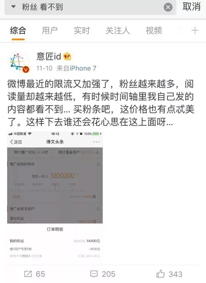 粉絲看不到關(guān)注人的微博自然會困惑,但是更加困惑的,是早期為微博帶來巨大流量的大V們。從2010年開始玩微博的知名美學(xué)設(shè)計(jì)博主、金V用戶“意匠id”吐槽,粉絲越來越多,閱讀量卻越來越低,有時(shí)候時(shí)間軸里自己發(fā)的內(nèi)容都看不到。