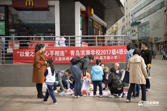 青島新聞網(wǎng)3月31日訊(記者 張力偉)“為我們貧困山區(qū)的小朋友貢獻(xiàn)一點(diǎn)愛心吧!”“快來看快來買啊,24色水彩筆,只要5塊錢!”31日上午,青島濱海學(xué)校2017級四班的同學(xué)們變身愛心義賣跳蚤市場的小攤主,在臺東步行街售賣自己的閑置小物,將籌得的善款捐獻(xiàn)給甘肅禮縣萬家小學(xué)的師生們。