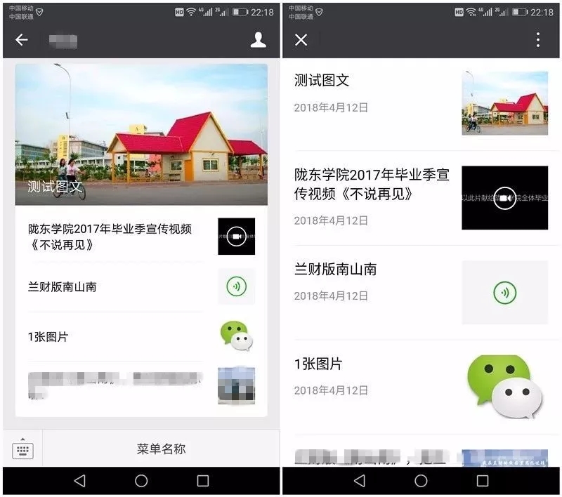 改版后的公眾號(hào)視頻、音頻、圖片推送效果圖如下,左圖為會(huì)話(huà)框效果,右圖為歷史消息效果圖:
