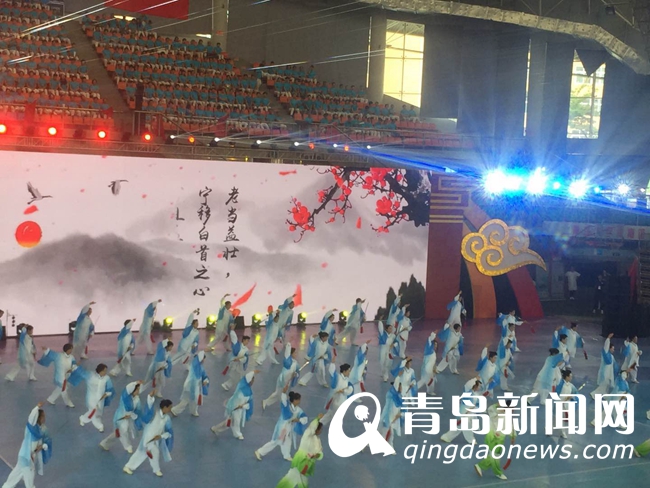 主持人宣布運動會開始后,第四屆山東省老運會開幕式大型文藝展演正式開始。此次展演充分展示我省廣大中老年人健康向上精神風貌的宗旨,同時突出老年體育特色項目,以海納百川的姿態(tài)歡迎全省各地市老年朋友們。演出進行到高潮的時候,臺上臺下精彩互動,現(xiàn)場觀眾熱烈響應,整個體育館形成一片歡樂的海洋。