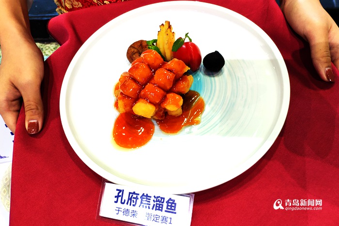 青島上合峰會(huì)國(guó)宴主會(huì)場(chǎng)廚師長(zhǎng)于德榮在大賽上做的是孔府焦溜魚(yú),這道菜屬于酸甜口味,是在軟炸魚(yú)的基礎(chǔ)上演變而來(lái),汁芡明亮、外焦里嫩。其雖原料簡(jiǎn)單,但技術(shù)性較強(qiáng)烹調(diào)時(shí)必須在選料、切配、上漿和烹制上下功夫,才能做好這道菜。