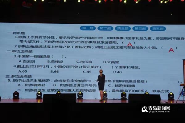 知識問答環(huán)節(jié),選手們沉著應對,就導游人員職業(yè)道德素養(yǎng),導游業(yè)務知識,文明旅游知識,突發(fā)事件處置等一一作答。在才藝運展示環(huán)節(jié),精彩的山東快板、歡快的舞蹈等表演,讓觀眾們看的如醉如癡,充分展現(xiàn)了島城導游的綜合素質(zhì)。